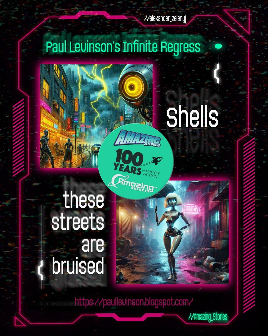 And, indeed, Alexander Zelenyj's "These Streets Are Bruised" and "Shells", both published in Amazing Stories in the past couple of years, are eminently exceptional. Indeed, their story about robots, androids, or, as they are called in these two tales, "More-than-Men" and "fakemen" and worse things by some folks we encounter, fit well in the lineage started by Ambrose Bierce and Karel Čapek, hoisted into pre-eminence by Isaac Asimov, and continued by a handful in the ensuing decades.